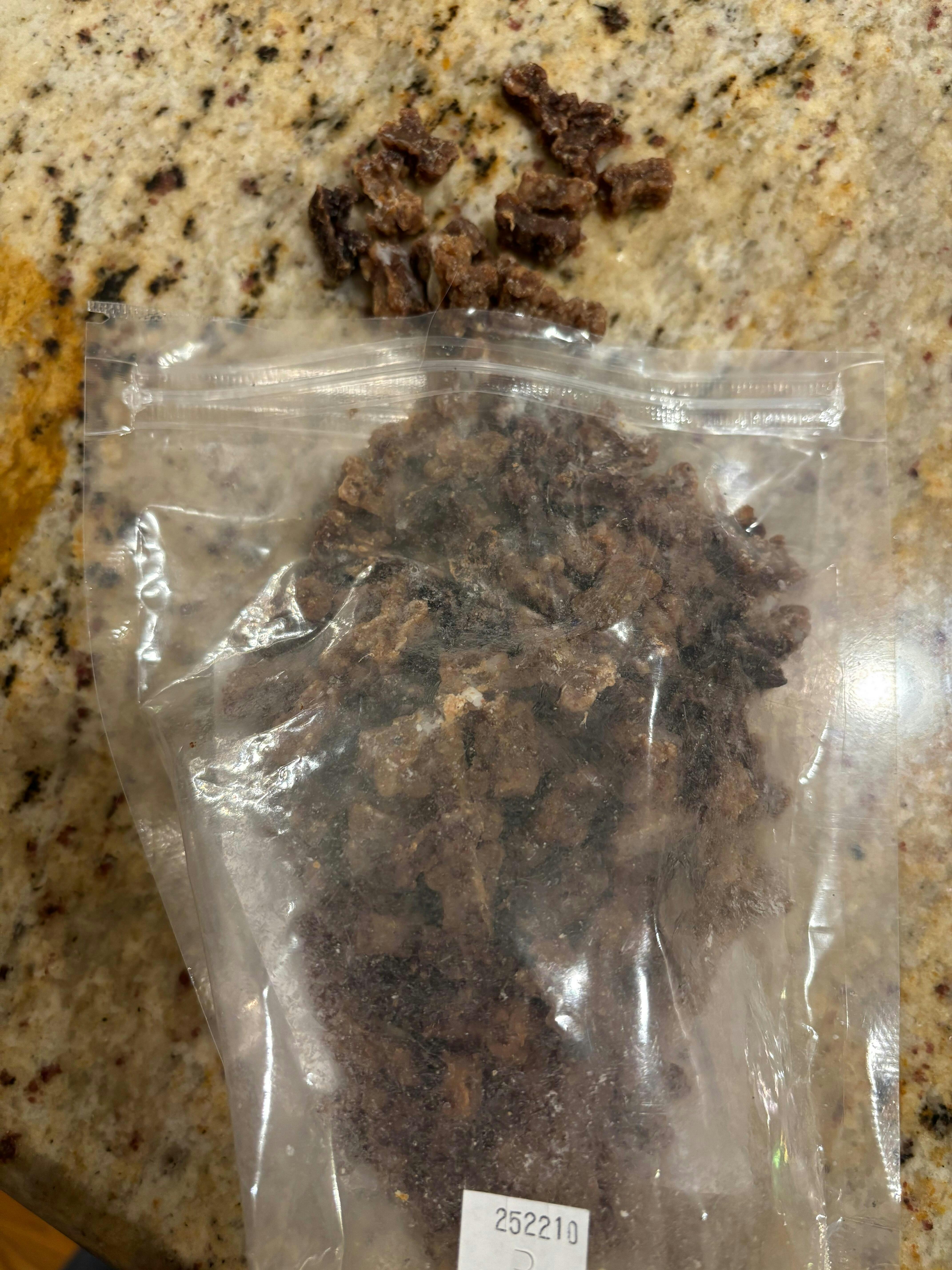 I bought a bag of the Venison hired from a pet store today and they are discolored white on one side and quite hard. I’m disappointed that this product is not as expected.