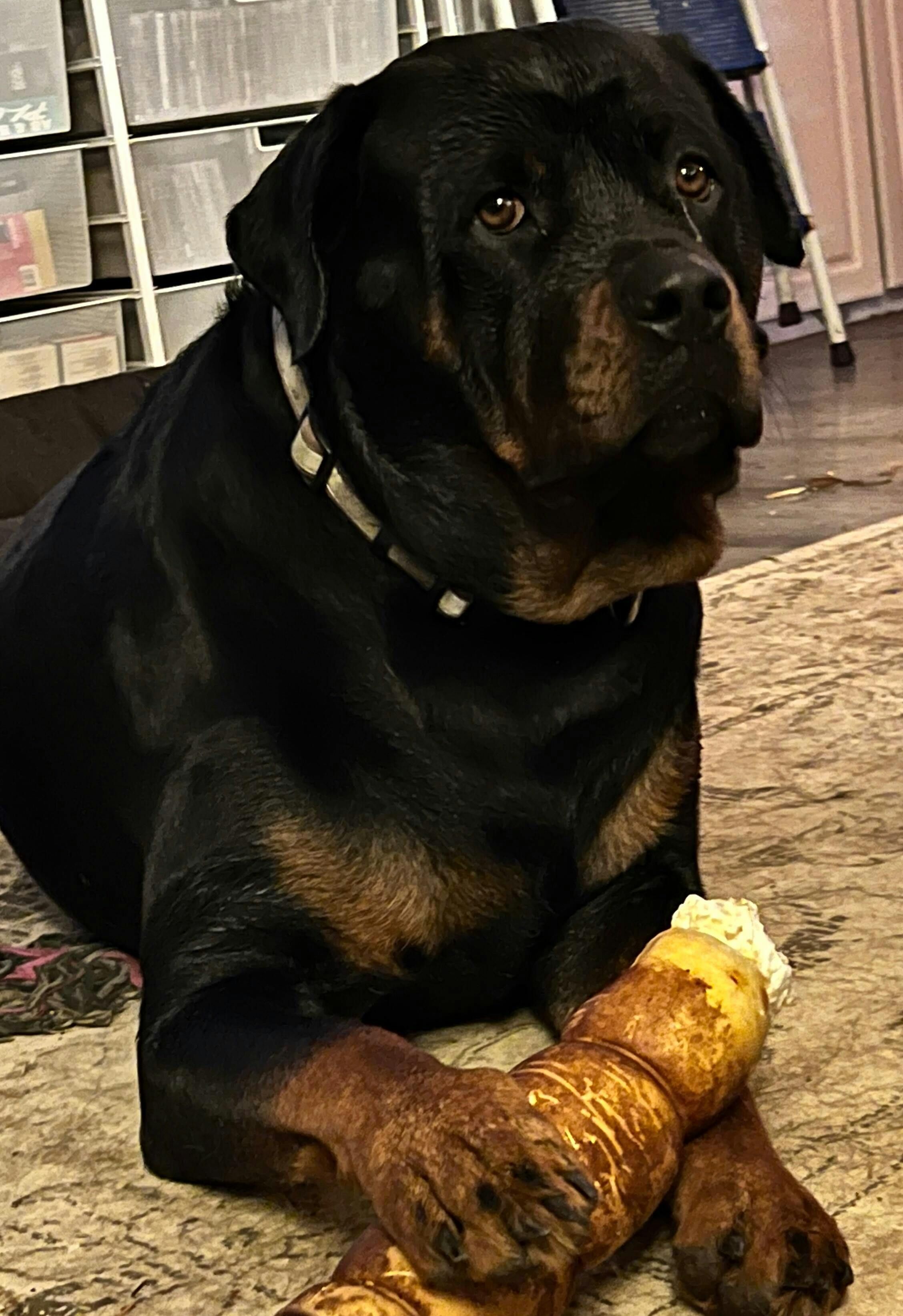 Finally Yay, so happy I have something big enough for any tough chewing dog to keep him busy longer than 10 minutes. He’s a 85 pounds black lab possibly pit bull mix and we named him Chewy because he loved to chew/destroy things as a puppy. Toys and other chew treats would last 15 minutes. He just chewed on this for 45 minutes and barely made a dent!