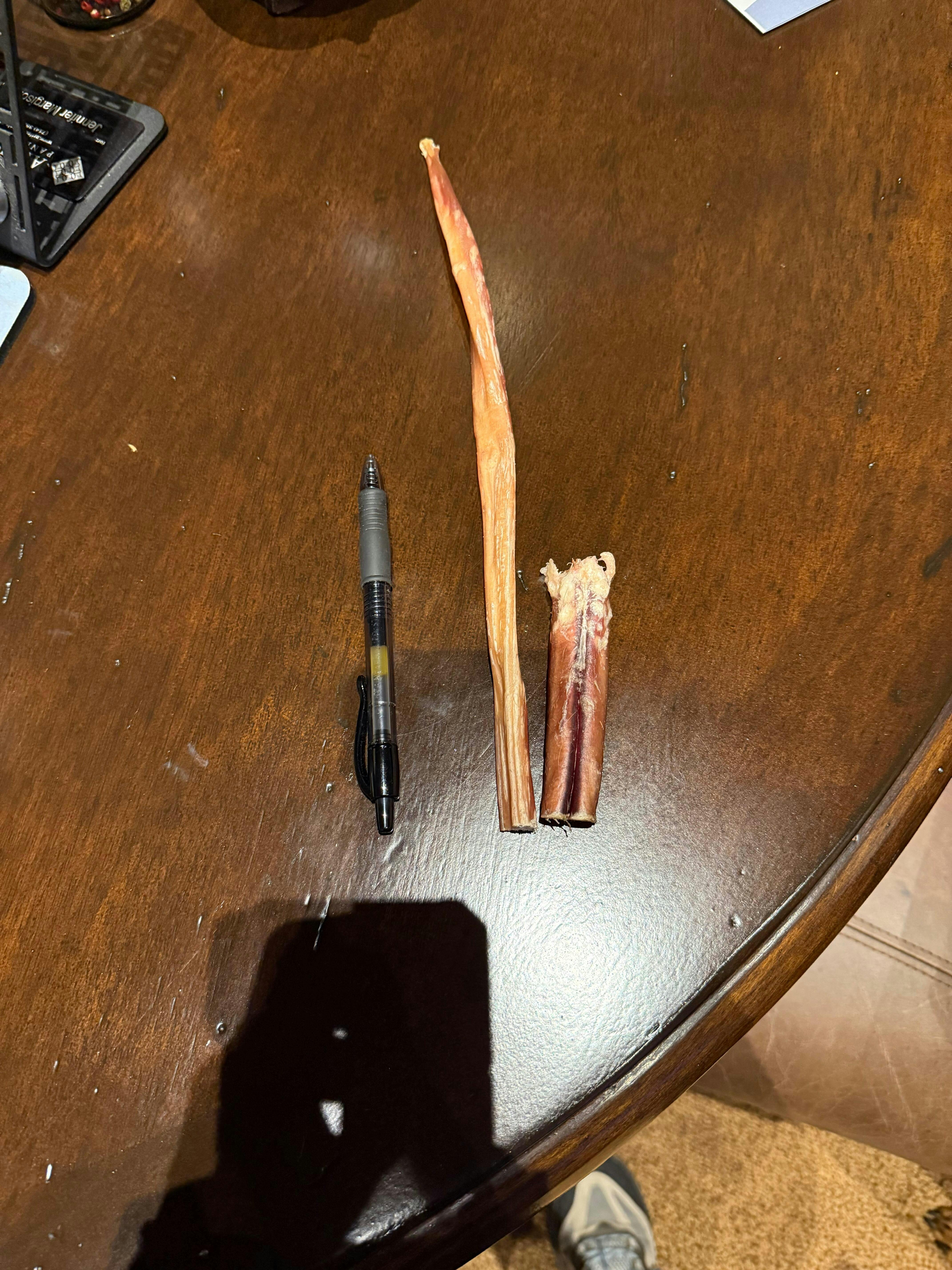 There had to be a miscommunication when I called and asked about ordering the biggest, thickest, longest lasting bully sticks for our 2 yr. old Doberman that is an aggressive chewer. I have bought Tuesday’s bully sticks at dog shows and retail locations that were really thick. What we got were pencil thin and didn’t last 12 minutes. The dog is still happy, but I need to stretch our dollars with longer lasting chews. I am hesitant to order online again. Photo shows a thicker bully remnant next to one of the new sticks. All sticks in our order were super thin and not what we requested when I called to inquire. I’m hoping we can figure out where the problem is in ordering the right product for our pup.